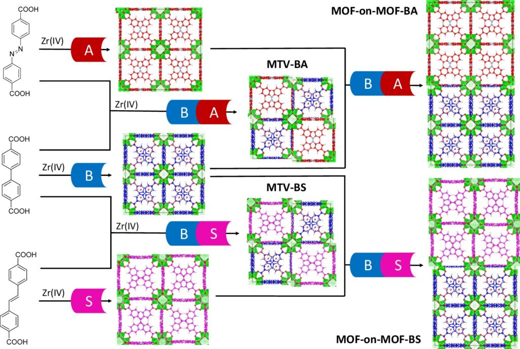 The group compared two heterostructure strategies. Multivariate MOFs mix multiple ligands within one lattice. MOF-on-MOF grows one MOF on top of another. Using UiO-67 as the core and Zr-AzoBDC or Zr-StilBDC as shells, the MOF-on-MOF design reached a quantum yield up to 40%, roughly four times higher than single-ligand baselines and far above comparable multivariate mixes at about 10%. Higher quantum yield means more photons per joule, which directly lowers the wall-plug power needed for a target luminance.