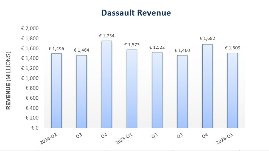 VELIZY-VILLACOUBLAY, France, Apr 23, 2026 – Dassault Systèmes has announced its Q1 FY26 results, reporting €1,509M in revenue – a 10.3% decrease from €1,682M in Q4 FY25 – with a profit of €293M.