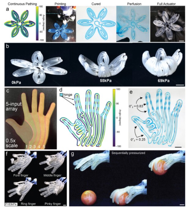 Demonstrations include a spiral actuator that unfurls when inflated and a five-fingered gripper capable of controlled bending and grasping motions. Because these motion patterns are encoded into the print path itself, designers can program predictable deformation into each device without molds or post-assembly.