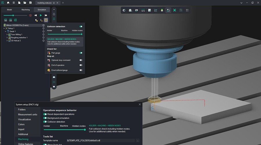 ENCY Software has updated simulation mode, refining collision detection controls and verification workflows. Collision settings now appear in a separate pop-up window when users hover over the indicator icon. The system enforces a minimum detection level in simulation mode based on the level defined for background simulation, so users cannot select a lower setting. If background collision detection is disabled or only partially enabled, simulation mode still allows users to choose the required verification level and run machining simulation independently.