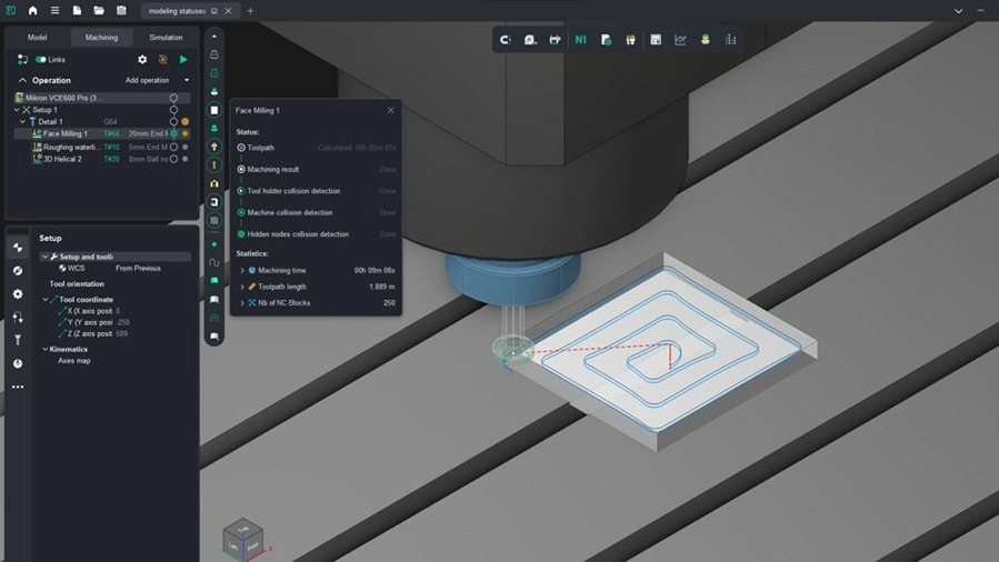 The system also allows users to select the level of collision detection, including holder-only checks for faster calculation, holder and machine scenarios, or full control of all machine nodes. New operation status indicators show how each toolpath has been verified. These controls allow users to manage calculation time, reducing unnecessary checks in complex projects while maintaining immediate feedback in simpler workflows.