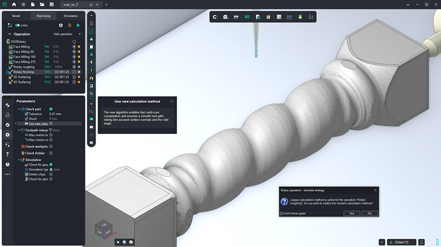 The update also removes the need to run a full step-by-step simulation to review machining results or check toolpaths for collisions. Users can select a verification level and use fast simulation buttons to run checks for a specific operation or for the full machining process. This approach reduces calculation time and targets operations needing review while preserving verification control.