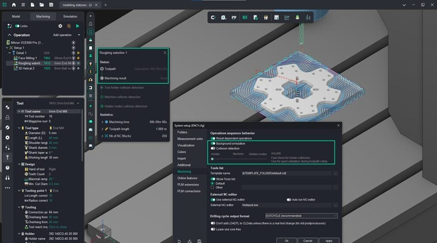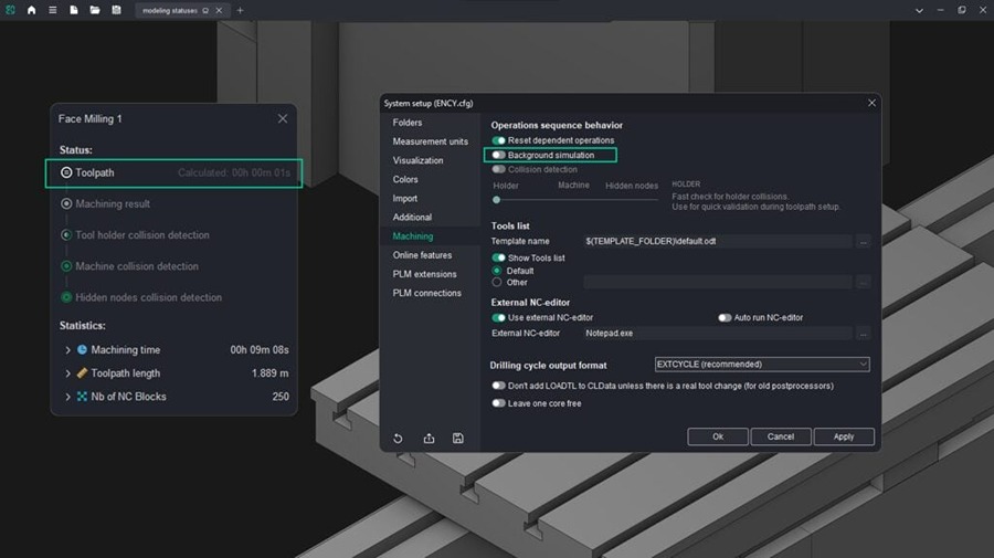 When background machining simulation is enabled, the machining result is available after toolpath calculation. This allows users to review the workpiece state without entering Simulation mode, which can be useful in projects without fine-step finishing operations. In this configuration, collision detection may be disabled.