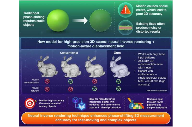 The new system uses a neural inverse-rendering framework that simultaneously models both the geometry of the object and its motion (expressed as a displacement field). In this way, the algorithm compensates for movement between pattern projections. Remarkably, it accomplishes high-resolution, high-accuracy 3D reconstruction using only three projection patterns, the same number typically employed for stationary targets in conventional phase-shifting.
