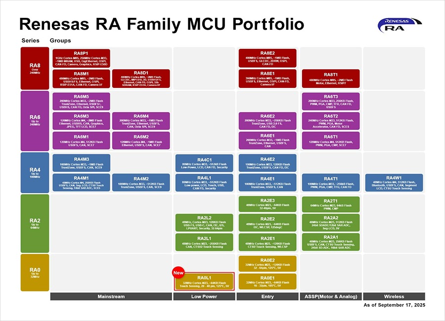 TOKYO, Japan, Sep 18, 2025 – Renesas Electronics has introduced the RA0L1 microcontroller (MCU) group, built on the Arm Cortex-M23 processor. The devices are designed for low power use and include capacitive touch for battery-powered consumer electronics, appliances, and industrial control systems. The RA0 series, launched in 2024, is known for low power consumption and low cost. The RA0L1 devices add capacitive touch functionality for creating low-power user interfaces at low cost.