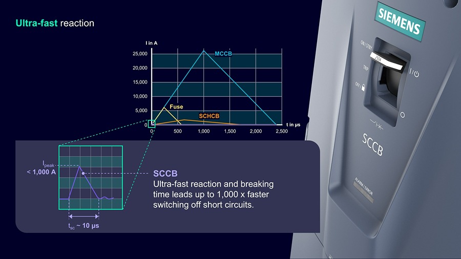 The SENTRON 3QD2 uses semiconductor technology and protection algorithms to interrupt short circuits in microseconds, up to 1,000 times faster than conventional circuit breakers. This response meets protection requirements in DC grids and maintains system operation during fault events.