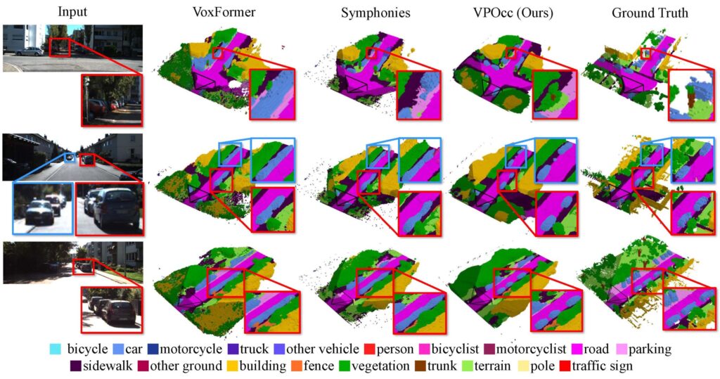 In benchmark tests (such as SemanticKITTI and SSCBench-KITTI360), VPOcc outperformed existing models in mean Intersection over Union (mIoU) and scene reconstruction accuracy (IoU), especially in detecting distant objects and distinguishing overlapping entities, key for safe autonomous driving in complex environments.