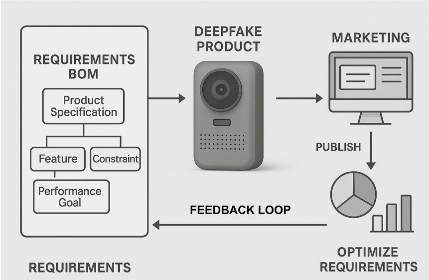 The key is the Requirements Bill of Materials (BOM), a structured list of what a product should do, not how it is built. Unlike a traditional BOM of parts and geometry, the requirements BOM defines functions, features, performance targets, and constraints. By generating a “deepfake product” based on those requirements—think digital rendering, VR demo, interactive simulation, or mock-up—companies can share a convincing prototype without a physical build. That lets potential users react early.
